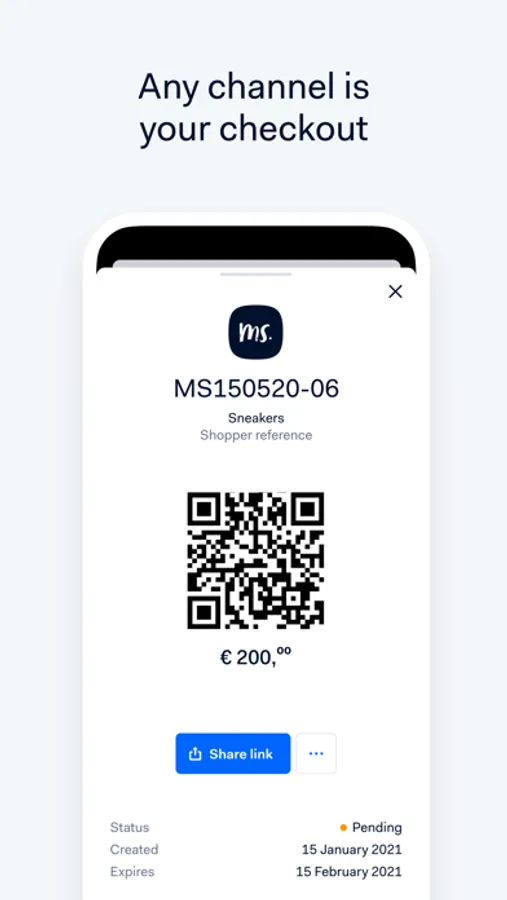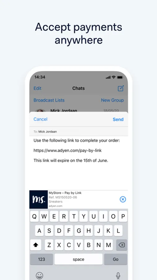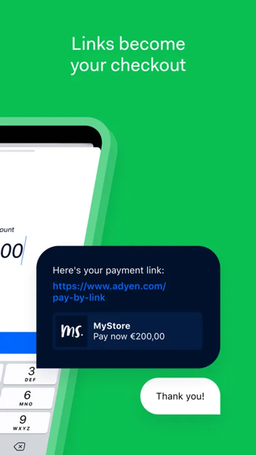 The fastest way to unlock contextual commerce. Offer a range of payment experiences and easily integrate using a customizable hosted checkout page that you can share in any channel. With Adyen’s app you can create links on the go and share them with customer’s to conclude payments in-store or remotely.