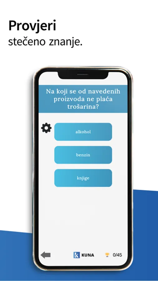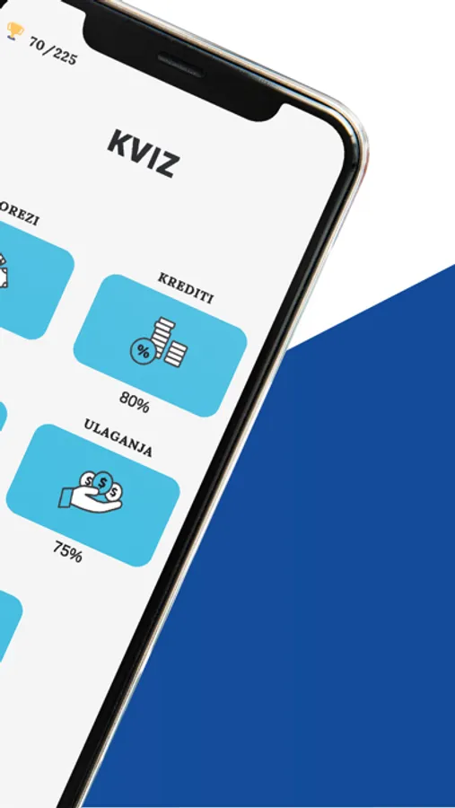 Na početnom zaslonu aplikacije nalazi se izbornik na kojem se odabirom tipke „Kviz“ pruža prilika za učenje i provjeravanje znanja iz pet kategorija: Porezi, Krediti, Štednja, Ulaganja i Mirovine. Unutar svake kategorije nalazi se edukacijski sadržaj i kviz od 15 pitanja za testiranje naučenog. Bilježenjem ostvarenih bodova mjeri se usvojenost pojedinog modula. Mogući minimalni broj osvojenih bodova je 15, dok je maksimalni 45 po kategoriji. Za svaki točan odgovor iz prvog pokušaja, korisnik dobiva 3 boda, iz drugog 2, a iz trećeg 1 bod. Na ovaj način korisnik uvijek dolazi do točnog odgovora i tako usvaja znanje.