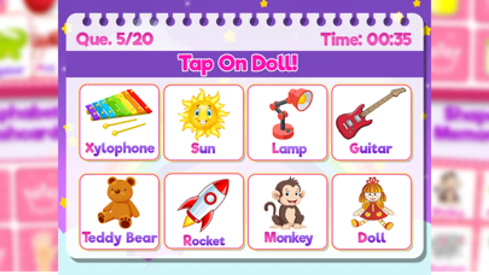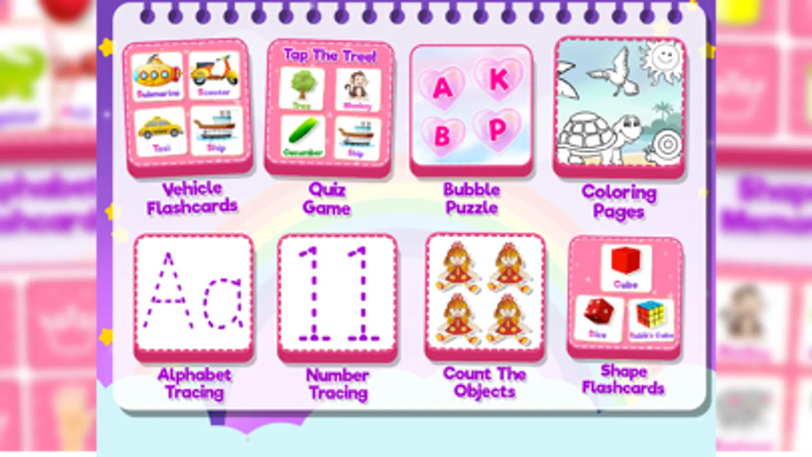 Game has a collection of FUN & EASY to learn the alphabet, numbers, colors, shapes, animals, musical instruments, days & months, Also included in this app are coloring pages, puzzles, the bubble game, and a quiz.