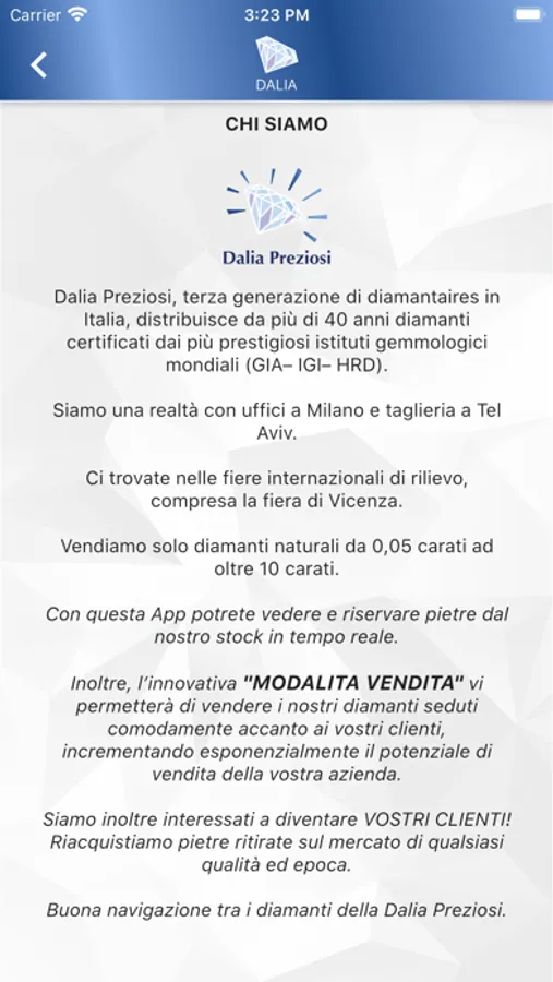 Dalia Preziosi, terza generazione di diamantaires in Italia, distribuisce da più di 40 anni diamanti certificati dai più prestigiosi istituti gemmologici mondiali (GIA– IGI– HRD). Siamo una realtà con uffici a Milano e taglieria a Tel Aviv.