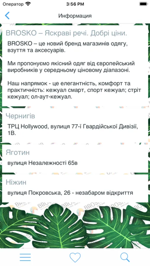 BROSKO – це новий бренд магазинів одягу, взуття та аксесуарів. Ми пропонуємо якісний одяг від європейський виробників у середньому ціновому діапазоні. Переваги додатку: -Ви завжди будете в курсі всіх акцій, знижок та спеціальних пропозицій -Отримаєте доступ до програми лояльності BROSKO BONUS, яка дозволяє накопичувати та використовувати бонуси з кожної покупки -Матимете можливість отримувати додаткові бонуси та знижки завдяки спеціальним промокодам -Першим побачите новинки та трендові речі сезону