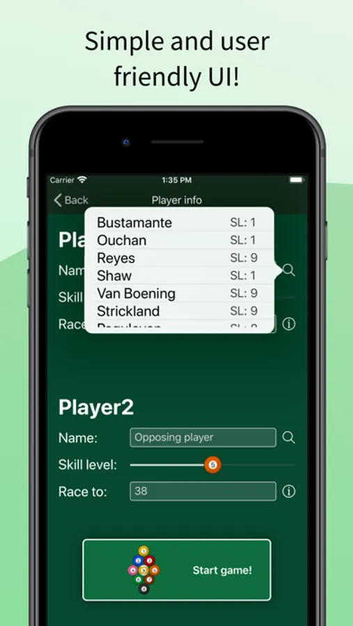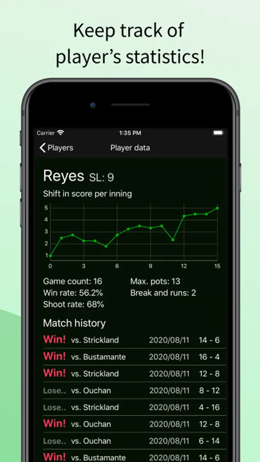 ・Keep track of player's statistics such as number break and runs, win rate, shoot rate, etc..