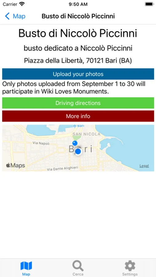 The Wiki Loves Monuments Italia app makes use of location and map features and is connected to OpenStreetMap and Wikidata to provide you with all available information about the monuments, such as name, description and address. It allows you to conveniently upload as many photos as you want to Wikimedia Commons, even while you're away from home. You can search for a specific city to see its photographable monuments, or search for them based on your location.