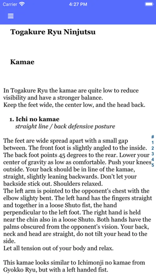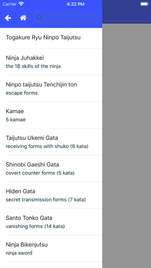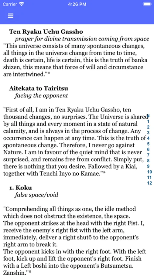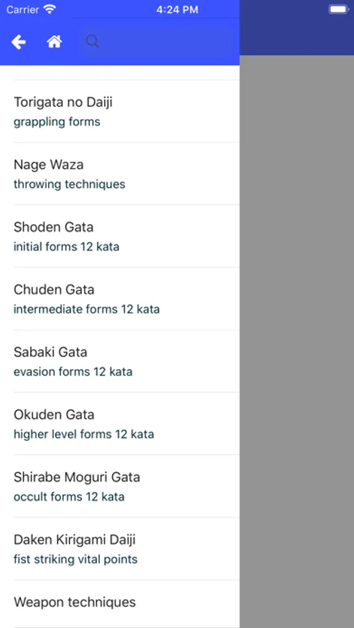 The app allows you to browse the kata grouped as in the scrolls and to quickly look up a specific technique for reference when training, or just out of curiosity.