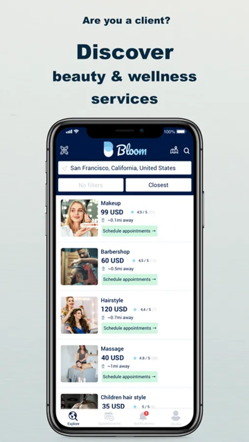 Are you working at a salon or are you independent? Bloom enables clients to discover your services and to schedule appointments online! Manage all your client appointments in the Bloom app.