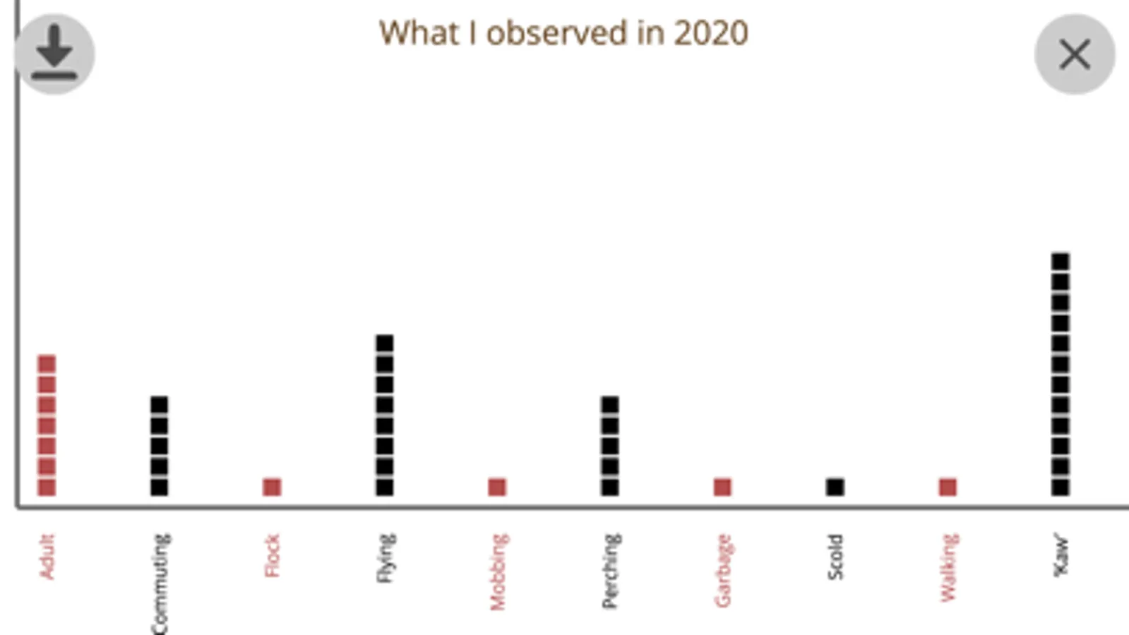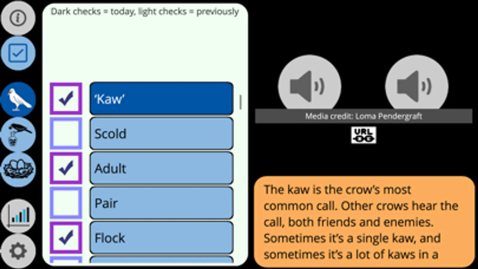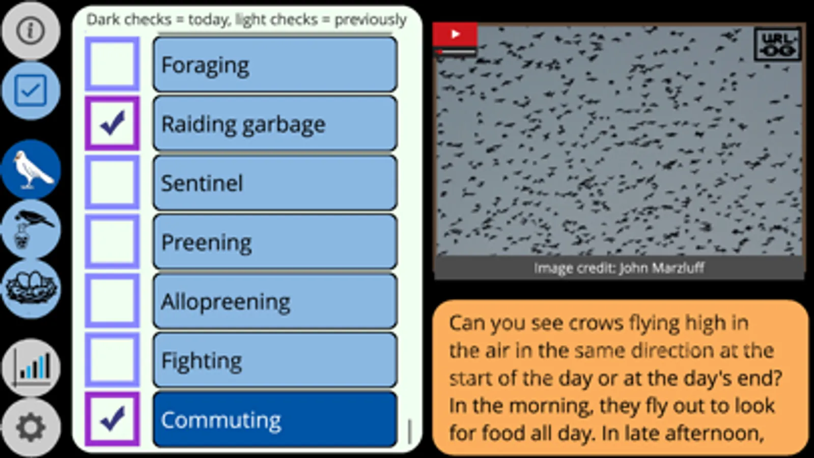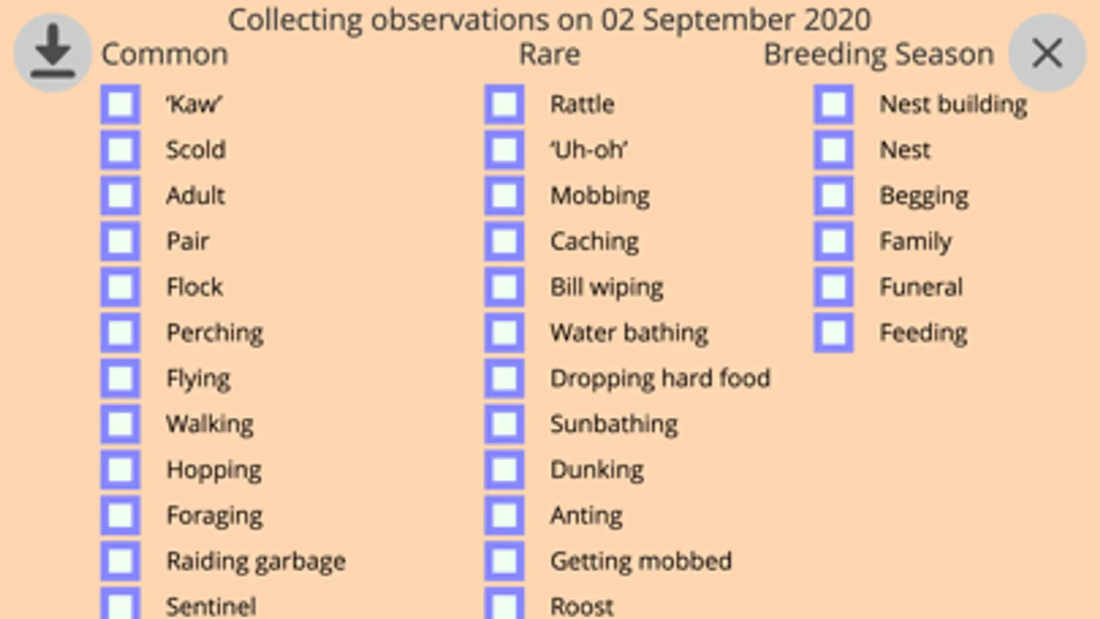Most observations are behaviors, such as “foraging,” and some are calls. The app includes photos of behaviors and audio recordings of crow calls to help the young scientist identify them. Checking all 18 items earns the young scientist a certificate to share or to print out.