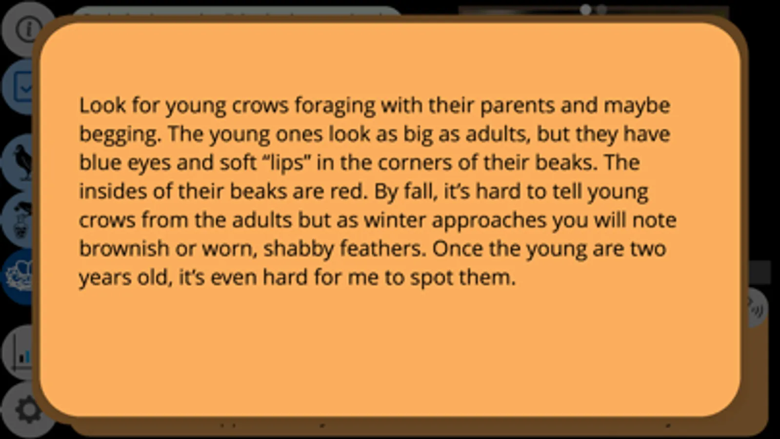 Another list describes observations associated with the breeding season, such as juvenile crows or their distinctive begging call. Young scientists love to learn about animal families, and they love to learn to identify crow families. They also learn that in the cycle of life most young crows don’t survive. Again, if the player checks all the items, they earn a certificate to share and print.