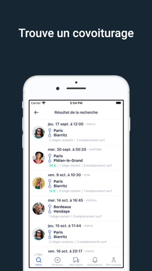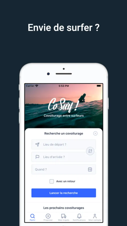 Découvre les prochains départs pour partir surfer. Grâce à Cosurf tu peux indiquer le type et le nombre de planches que tu souhaites transporter dans le covoiturage. Fini les galères de logistiques !