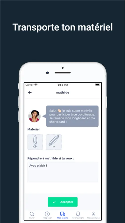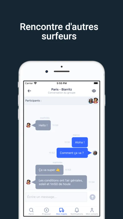 Cosurf est une application entièrement gratuite ! Une fois accepté(e) dans le covoiturage, tu auras accès à une messagerie permettant de t’organiser avec les différents participants. Libre à vous ensuite de vous organiser pour le partage des frais liés au trajet.