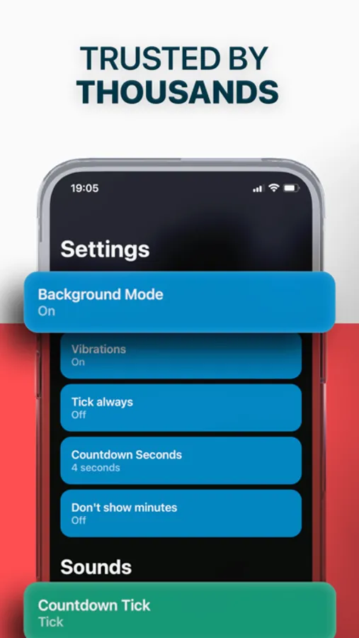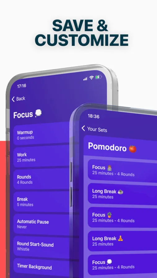 Create complex sets and get them visualized simple and minimalistic with big digits, bright colors and hand-crafted sounds to support you keeping the focus.