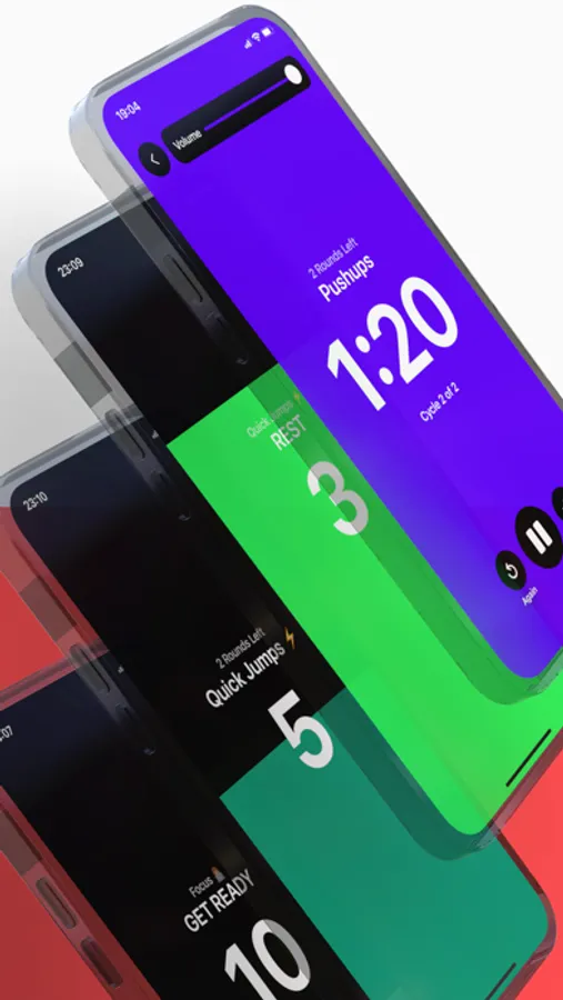 Create simple second-short or complex hour-long intervals with custom set and cycle durations including custom break- and warmup-lengths, round-counts, sounds and colors.