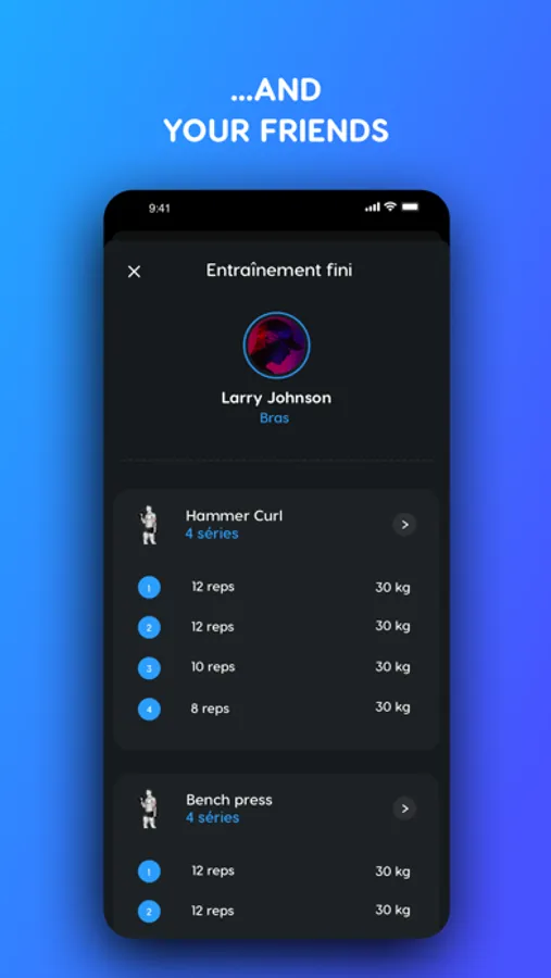 ● Curious about the performance of your friends at the gym ? You’ll get access to a summary of their workout once they’ll complete it.
