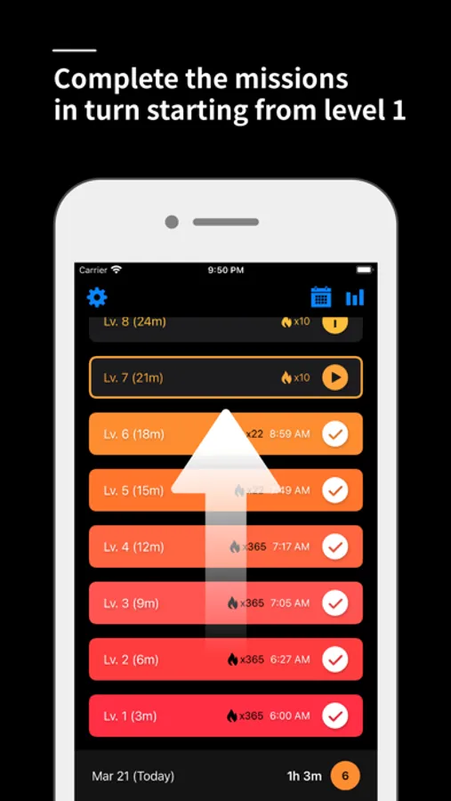 Level 3 is 9 minutes. Each time you level up in this way, you only need to focus 3 minutes more than the previous level.