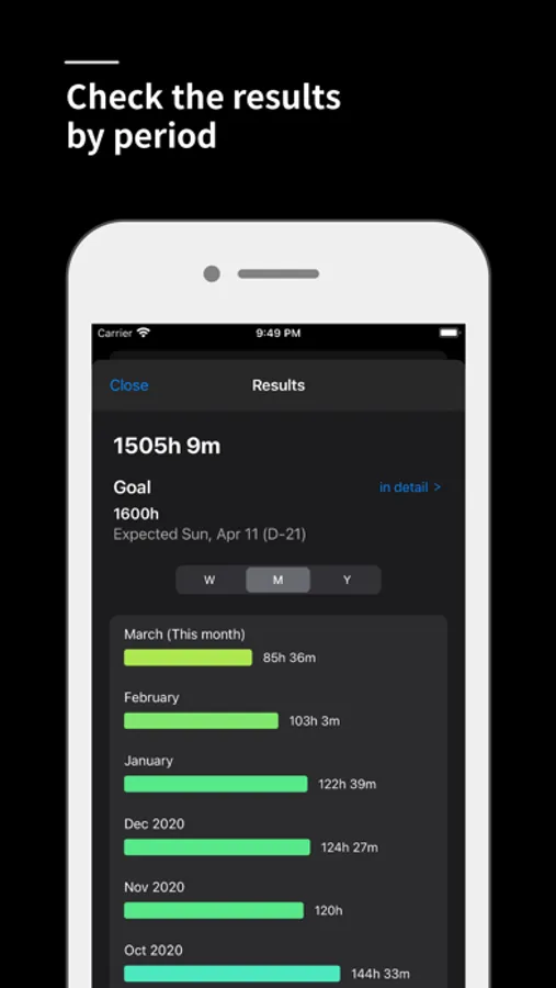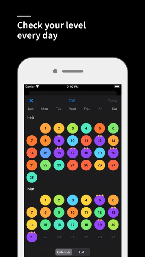 You can see at a glance your level of concentration for each day in the color displayed on the calendar.