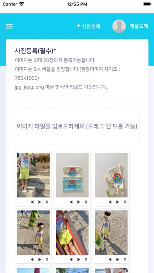 대용량 사진 한번에 업로드 .드래그앤 드롭기능으로 제품사진 최대 20장까지!