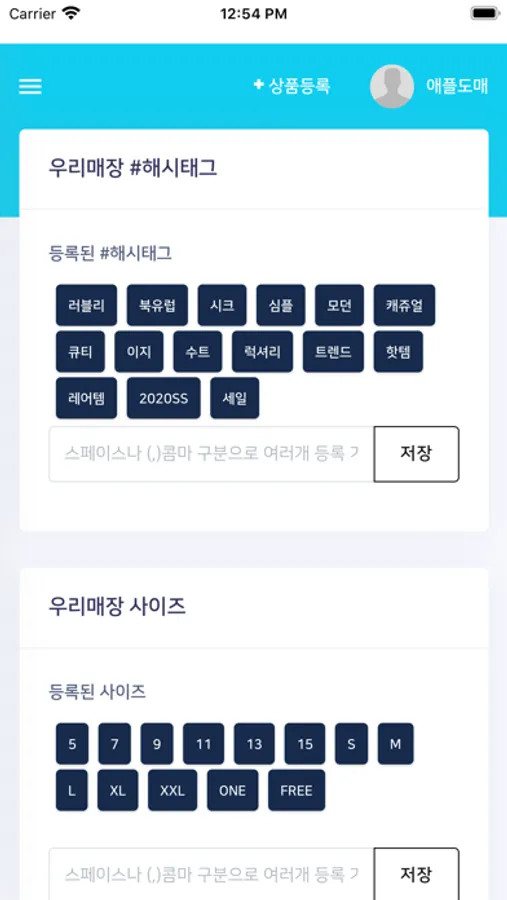 우리 매장사이즈,컬러 등 해시태그 입력가능