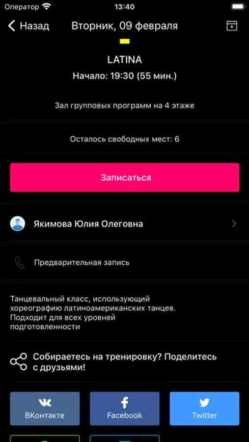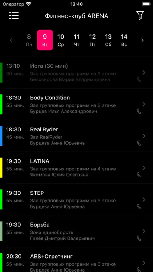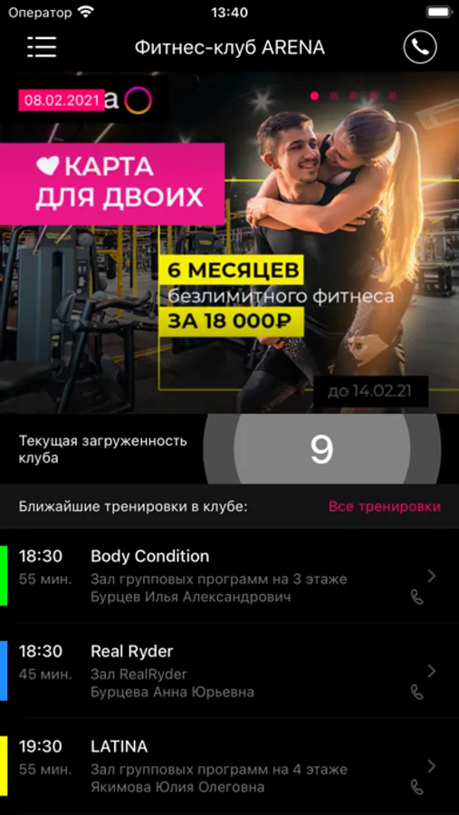 - Посмотреть расписание групповых программ и записаться на тренировку