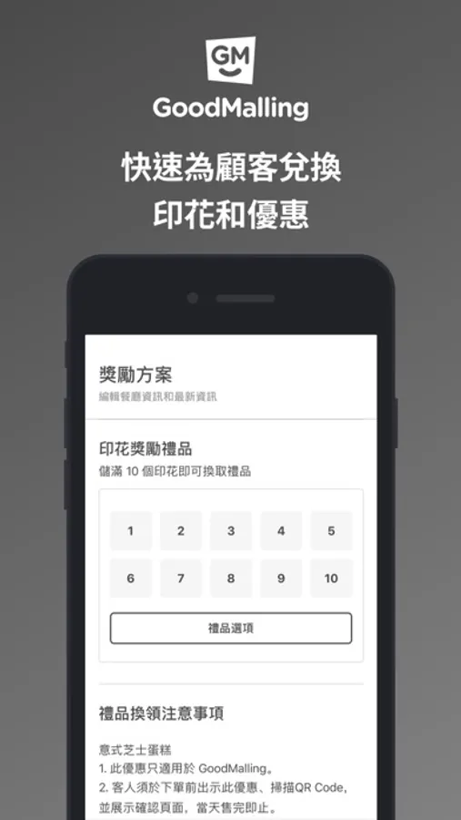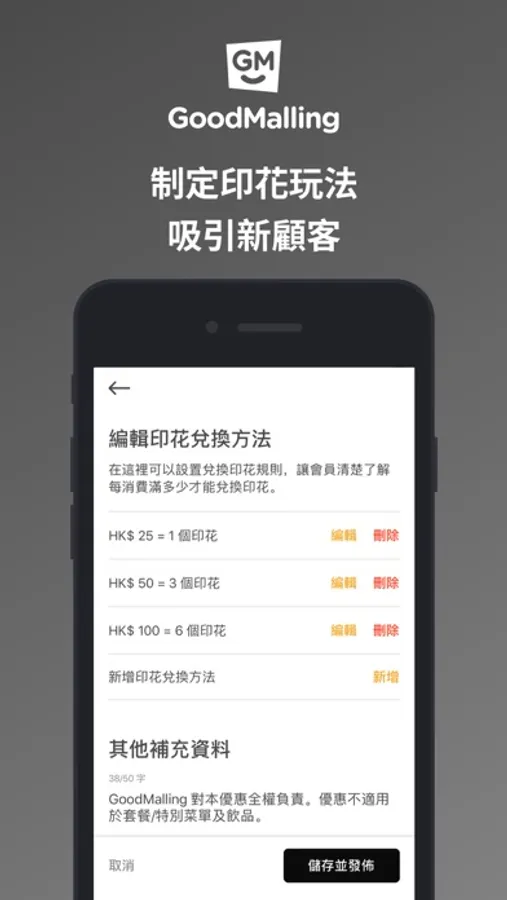 GoodMalling Partner讓你管理一切在GoodMalling上的美食優惠及印花奬勵規則都變得簡單至極,而且細節由你決定。使用GoodMalling Partner,你能夠: