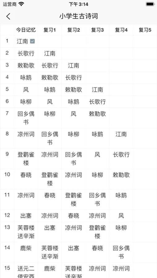 熟练唐诗以每天背诵一首唐诗为基础,以次日、第三天、第七天、第十五天和第三十天为复习周期,根据记忆周期进行背诵,变成长期记忆后,就不容易遗忘。