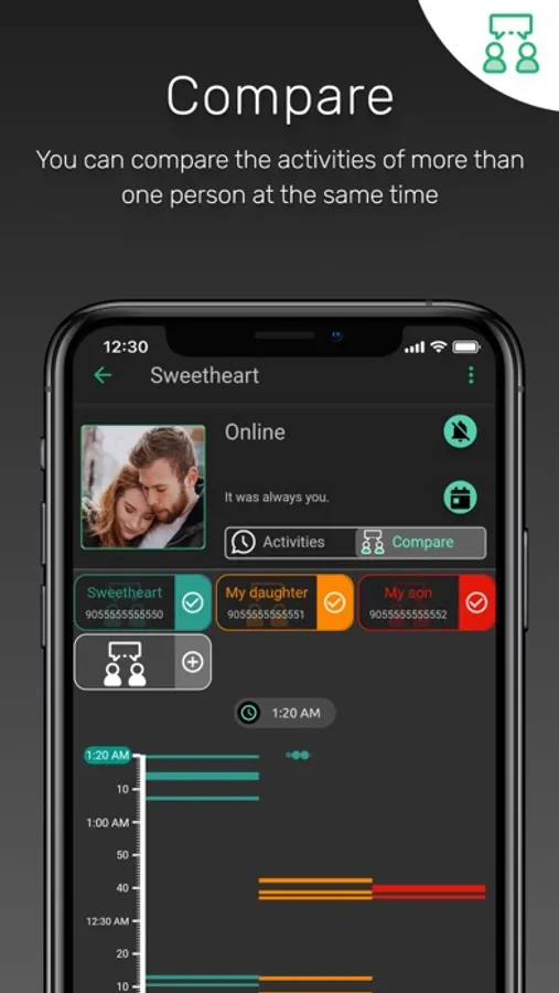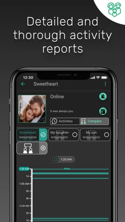 How much time do they spend on popular messaging apps? How long and when are they online? Who are they online with at the same time? Whenzup provides you a detailed online activity report about it. You can also compare all the reports one another and maybe these interactions are exactly what you need to know.