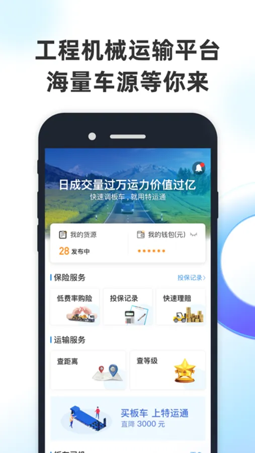 【特运通货主版】-专业工程机械、大件设备找车平台,包括挖掘机、装载机、推土机等机械设备,及电力类、化工类、桥梁类等大型设备,智能调度各种低平板、爬梯板、液压板等多种板车;让有大件运输需求的老板便捷发货高效找车,解决大件物流运输难题。