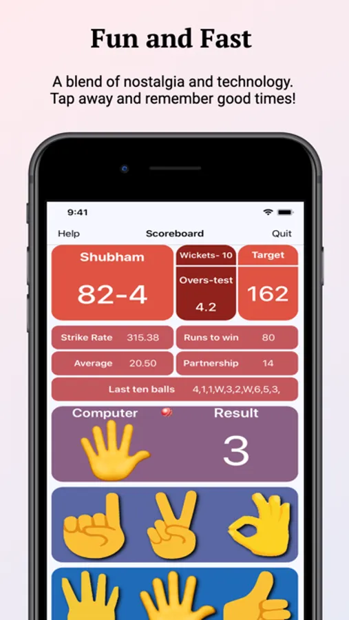 Playing this game is simple, fast, and convenient. Just tap as fast or as slow as you wish, and the game would be played at your speed. You no longer have to wait for your friends to put a number while they think! The scoreboard provides all the information you need to succeed. From your score to the strike rates and averages, there are all the statistics you would want. A cricketer's dream for real. Play with a lively experience and the touch of tapping a real button with the haptic feedback which vibrates according to the number you play. Tapping is definitely more fun now.