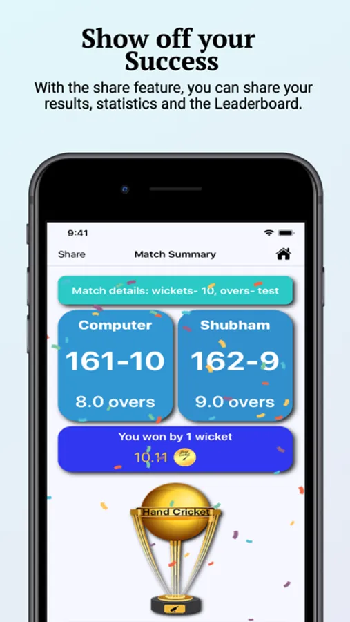 Hand Cricket will let you relive your past and provide you an enhanced experience with all the different and innovative features. There are 30 different combinations of formats ranging from 1 wicket and 1 over to 10 wickets and unlimited overs. This variety lets you choose and play with your favorite settings. Don't like to bowl? The target feature lets you set a target and play without bowling. There is something in it for everyone.