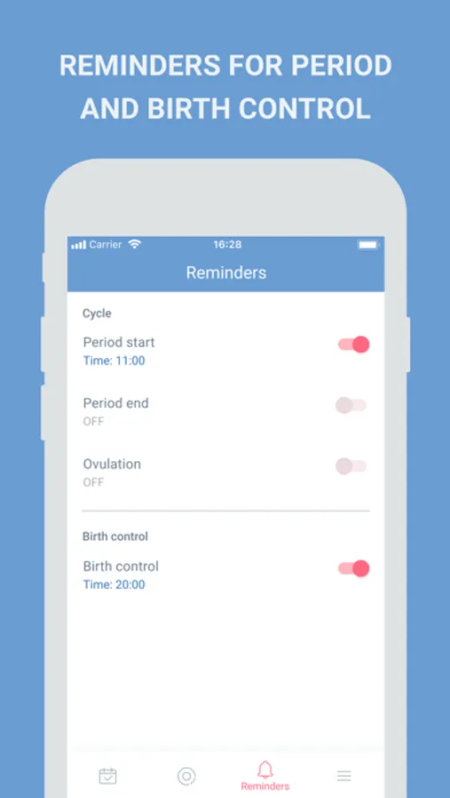You can set reminders for chosen type of birth control and won’t have to worry about forgetting or getting confused: the app will automatically take into account necessary contraceptive pill-free periods, will remind you about vaginal ring, etc.