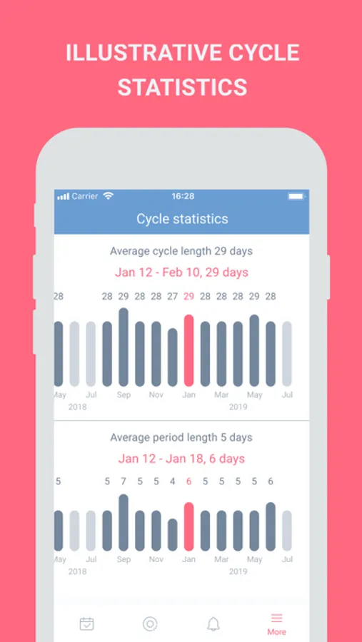 To make control over cycles even easier Period tracker graphically shows cycles statistics, representing cycle length and period length for each month in charts.