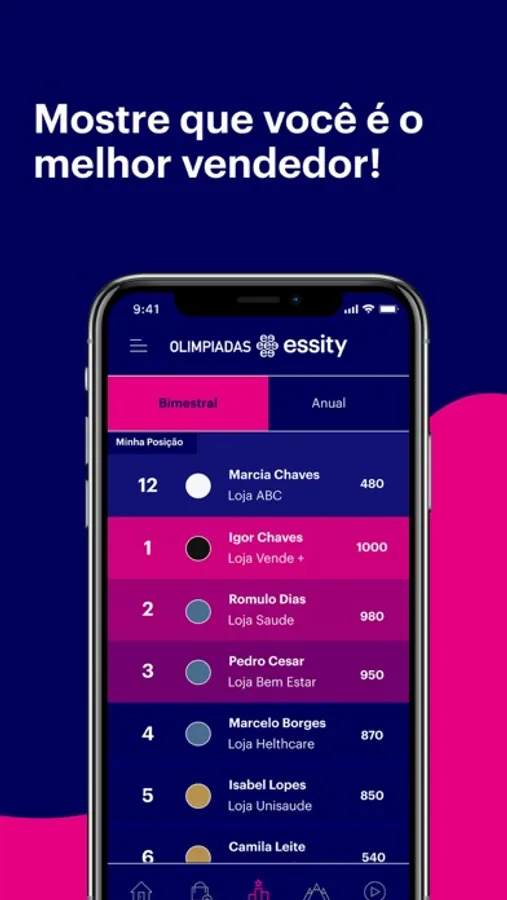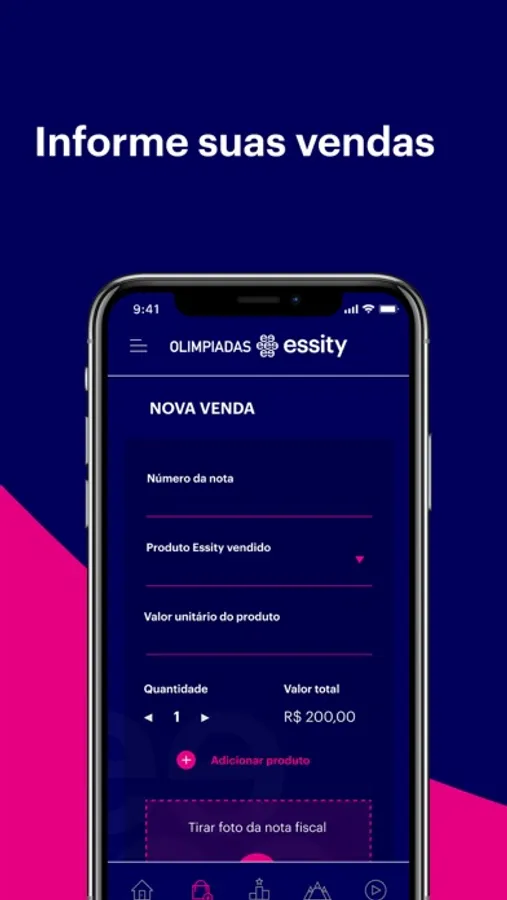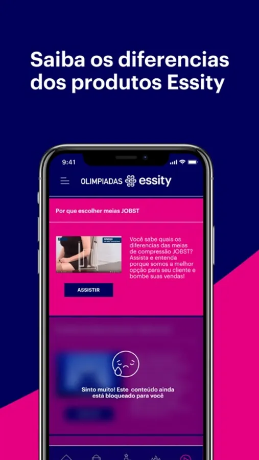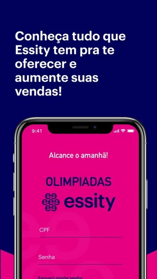 Aplicativo da campanha de vendas "Olimpíadas Essity" para a rede credenciada.