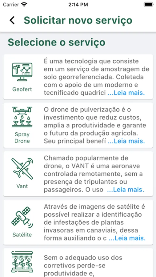 Destacamos as solicitações de serviços, pois, de uma forma simplificada, com apenas um clique, você poderá solicitar e acompanhar o progresso de suas solicitações: Análise de Solo (Geofert), Aplicação de corretivos, Drone de Imagem, Satélite, Spray drone, Vant.