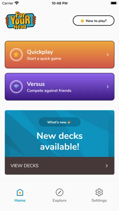 Right after installing this forehead game, you can start playing with others. Pick a card deck from different categories and tap on the deck to start. Hold the phone on your forehead like a headband and try to guess the word while other players provide you with clues!