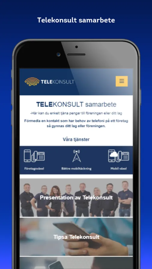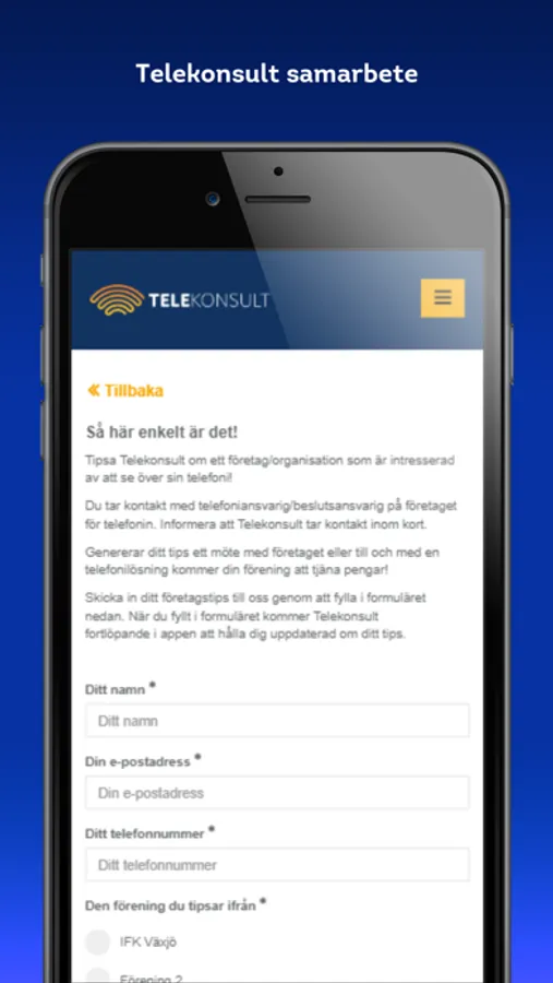 Som marknadsledande leverantör av telefonlösningar jobbar vi på Telekonsult med att erbjuda företag den bästa lösningen när det gäller företagstelefoni. Vår app för samarbete är till för att föreningar ska kunna tipsa oss om nya kunder och samtidigt tjäna pengar. I utbyte mot och som tack för ett lyckat tips får föreningen pengar från oss.