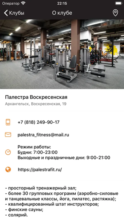 С помощью приложения вы можете получить полную информацию, включая фотографии, посмотреть актуальное расписание всех видов занятий клубов, записаться/отменить запись, получать оповещения о предстоящих тренировках и обо всех изменениях, ознакомиться со специальными предложениями клуба и узнать о предстоящих мероприятиях, отправить заявку на вступление в клуб, отправить заявку на заморозку и продление карты члена клуба