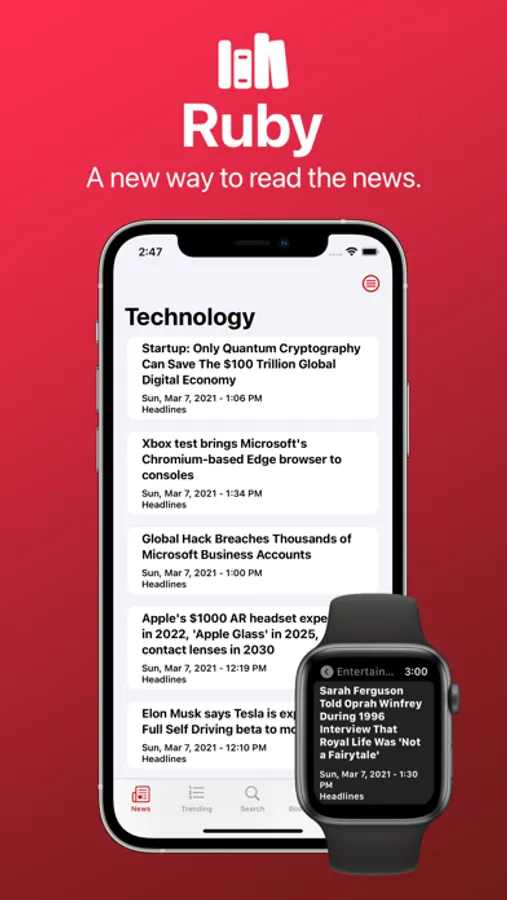 Ruby also offers an Apple Watch app, where you can quickly view headlines on your wrist. The Apple Watch app has the same functionality as the iPhone app, so you can easily read headlines of a specific topic, and more.