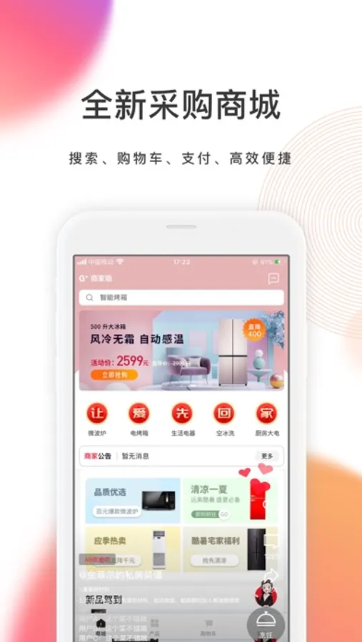 APP介绍:G+商家版是由格兰仕推出的一款经销商采购管理的手机软件,用于直供一站式采购的移动平台。支持在线查看商品和策略动态,销售数据一目了然,还可以进行互动交流。