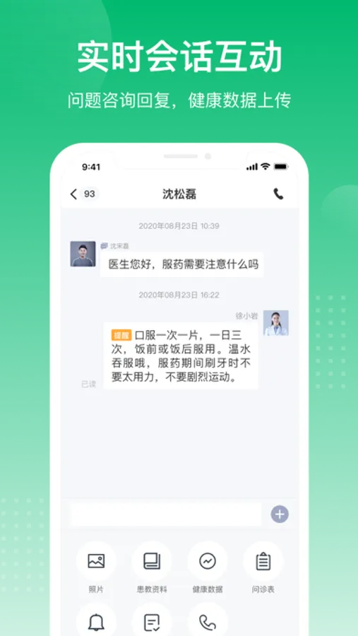 医务人员跟患者线上互动,可以在线发送生理指标、健康资料。