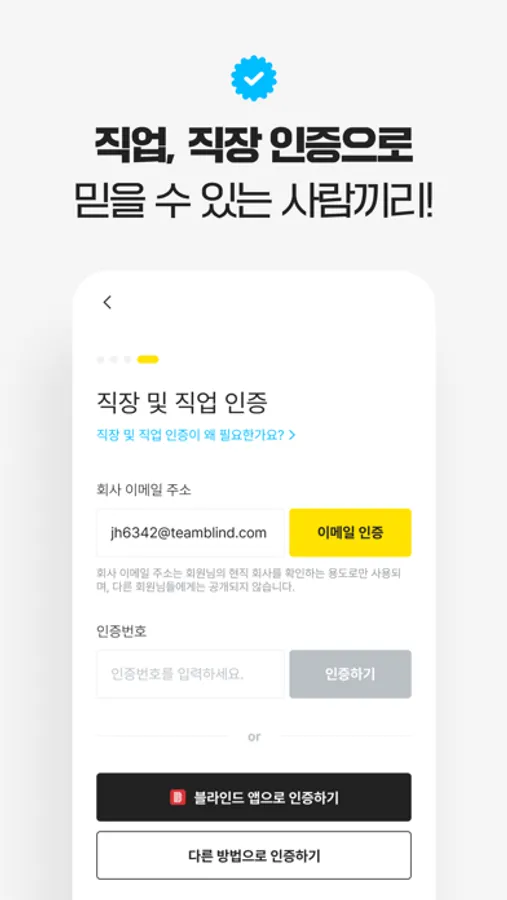 - 검증되지 않아 믿기 어려웠던 프로필 정보를 블라인드의 직장 인증 시스템으로 믿을 수 있는 프로필로 만들었어요