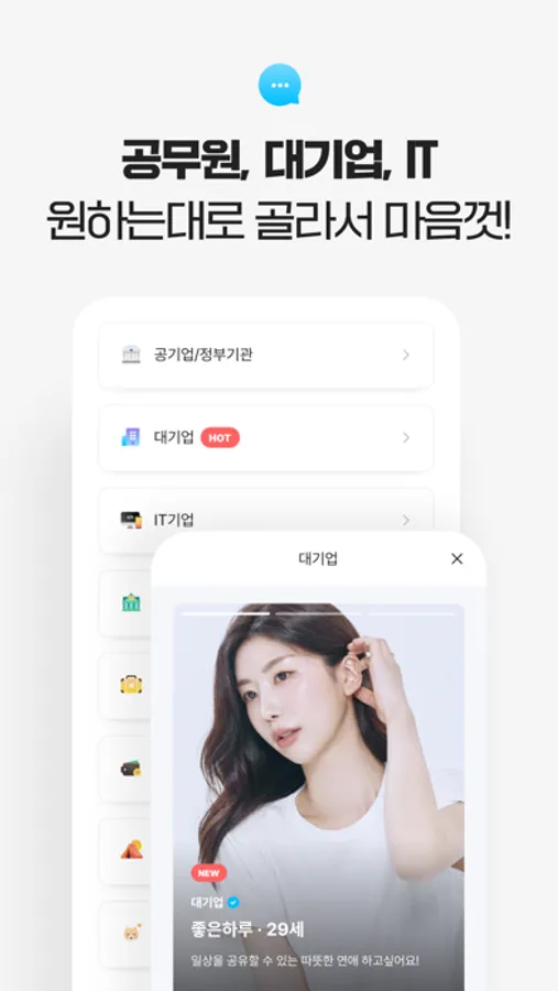 - 안정적인 사람과의 소개팅을 위해 다른 소개팅앱과 달리 직장이 있어야만 가입할 수 있어요 (모든 회원 100% 직장인)
