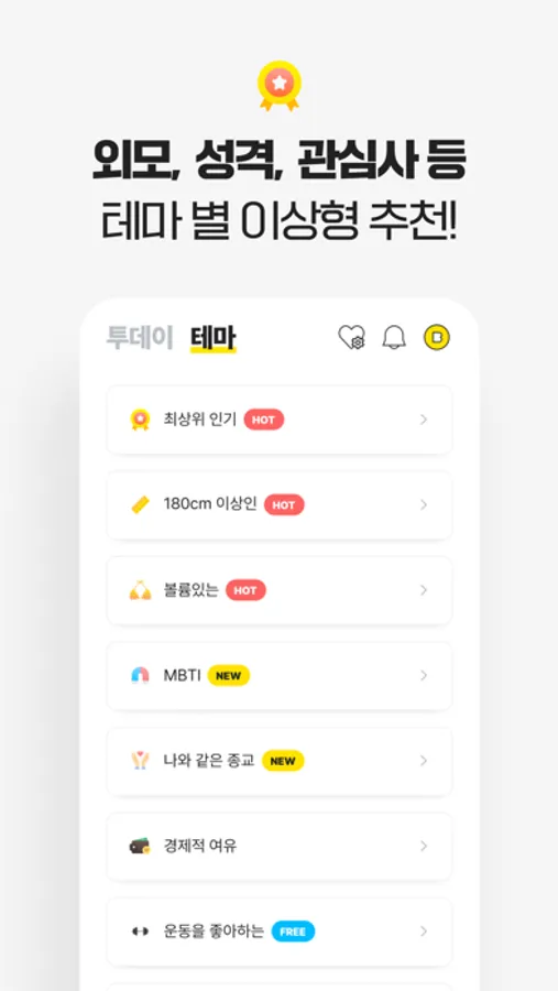 이제 외모, 성격, 직장, 관심사 등 원하는 테마 별로 이상형을 추천 받을 수 있어요!