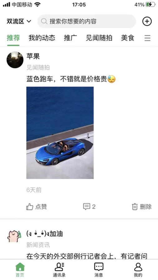 新闻资讯、推广、我的动态、生意转让、美食、出租、招聘等,覆盖国内各个城市,汇聚本地生活服务信息。