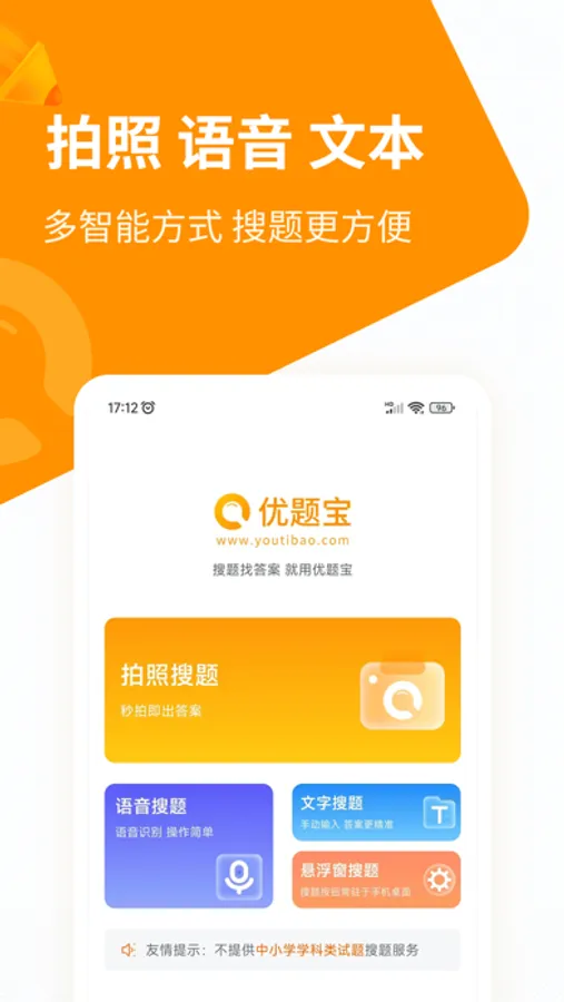 2、一键拍照搜题、一键语音搜题、一键复制文本搜题,多种一键搜题方式,总有一款搜题方式适合你;