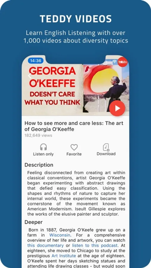 - 12 categories with video, audio and transcript, that means you are free to pick a topic that interests you and that will make the listening process more fun and engaging for you