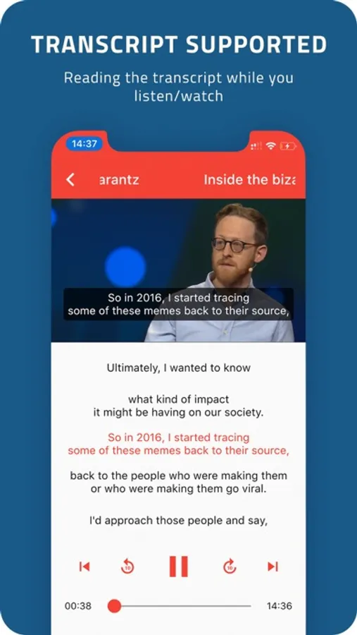 - Transcript tracking: the audio transcripts are highlighted and auto scrolled to help you focus on listening. However, you can turn off the subtitle if you want to improve your English listening skills.