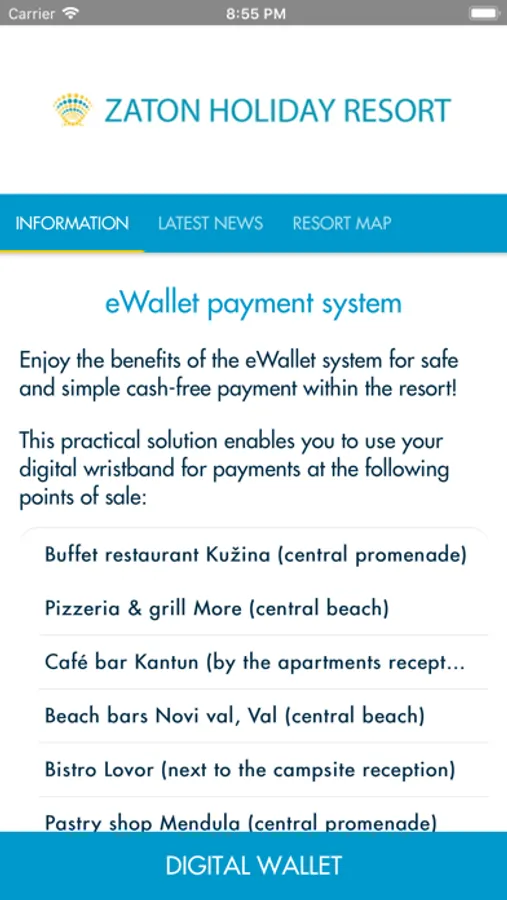 In addition to cashless payment, the app enables you to add funds to your eWallet account and to familiarize yourself with the resort's offer.