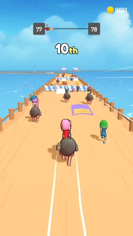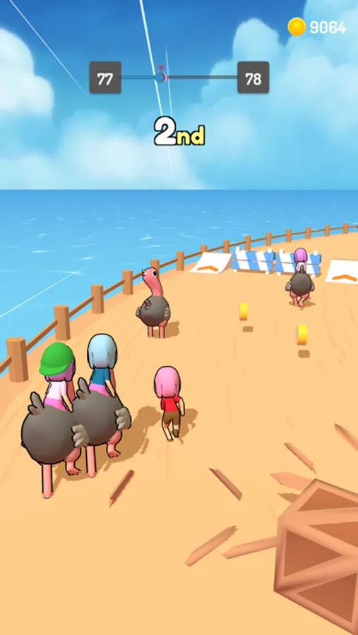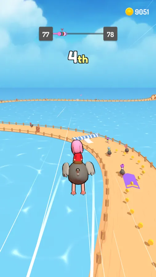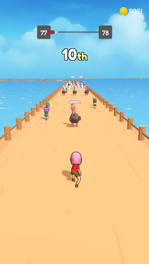 It is a racing game with bots you have on the same road. When you get and ride ostrich you can run faster. Riding ostrich is to have more power than single runners even pull to throw out competitors from the race. If you get wings as a booster you can fly and shorten a road. Have fun!