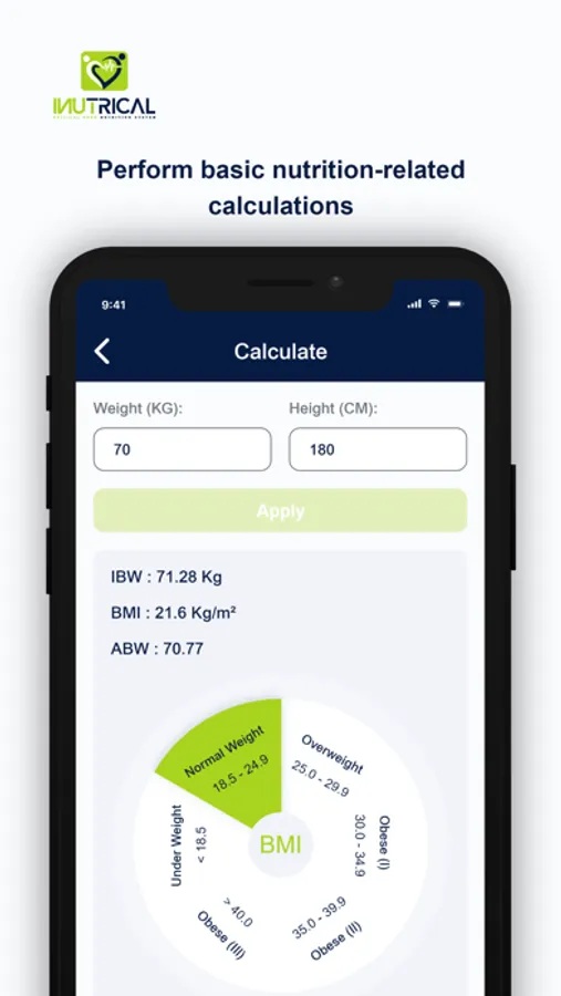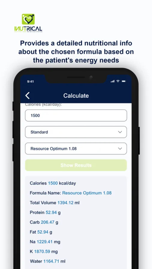 iNutriCal App enables users to precisely calculate the nutrient contents in the enteral liquid formula provided to patients based on their energy requirements. In few clicks, clinical dietitians can perform necessary calculations such as ideal body weight (IBW), body mass index (BMI), adjusted body weight (ABW), and choose the suitable liquid formula for the patient based on their health status. Further, this App allows users to retrieve, view, and print patients' medical and nutritional history from iNutriCal database and easily share it with other healthcare professionals within the hospital.