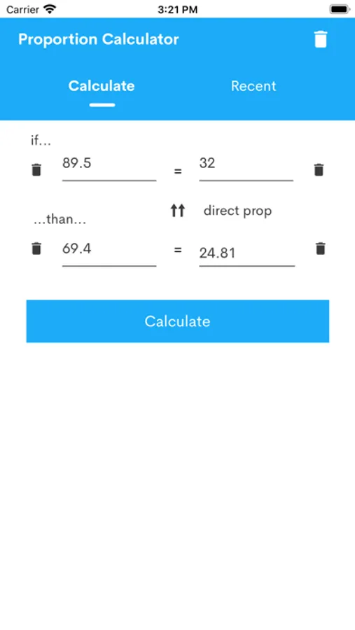 This App calculates proportions (direct or indirect), also known as "rule of three" by entering three known values and hitting "Calculate". The App will calculate the missing value for you!