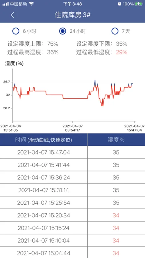 手机APP可以实时查看未处理/ 已处理湿度超标报警信息以及对应详情、对应曲线并处理。