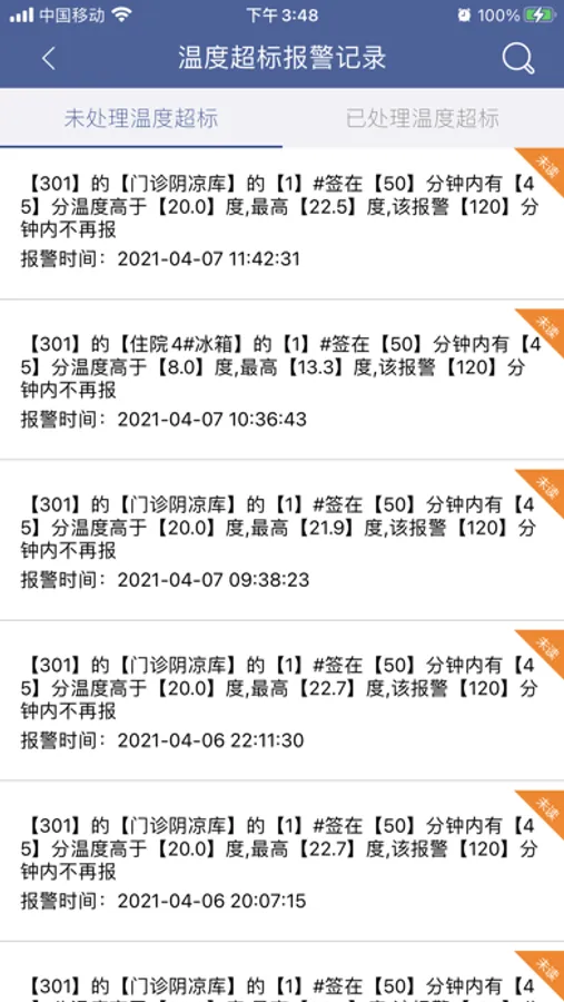 手机APP可以实时查看未处理/ 已处理温度超标报警信息以及对应详情、对应曲线并处理。